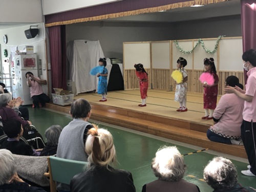 先日 ひかりヶ丘保育所 の園児さん15名がお遊戯の披露に来荘されました。