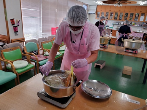 災害時における非常食作りを実施しました。停電と断水を想定して、カセットガスコンロにて、災害時用の水を沸かし、冷凍の食品の湯せんを行いました。