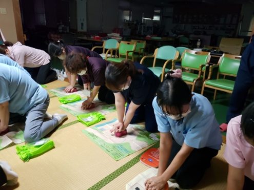 今回は、心肺蘇生トレーニングキット「あっぱくん」を用いての訓練です。